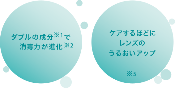 2種類の消毒成分※1を配合!消毒しにくい微生物やウイルスを消毒※2し、大切な瞳を守ります。さらに、潤い成分「機能性ヒアルロン酸」を配合※3。ケアするほどにレンズの潤いアップ※4。毎日のケアで潤い成分がレンズに蓄積し、装用中の乾燥感を軽減してくれます※5。