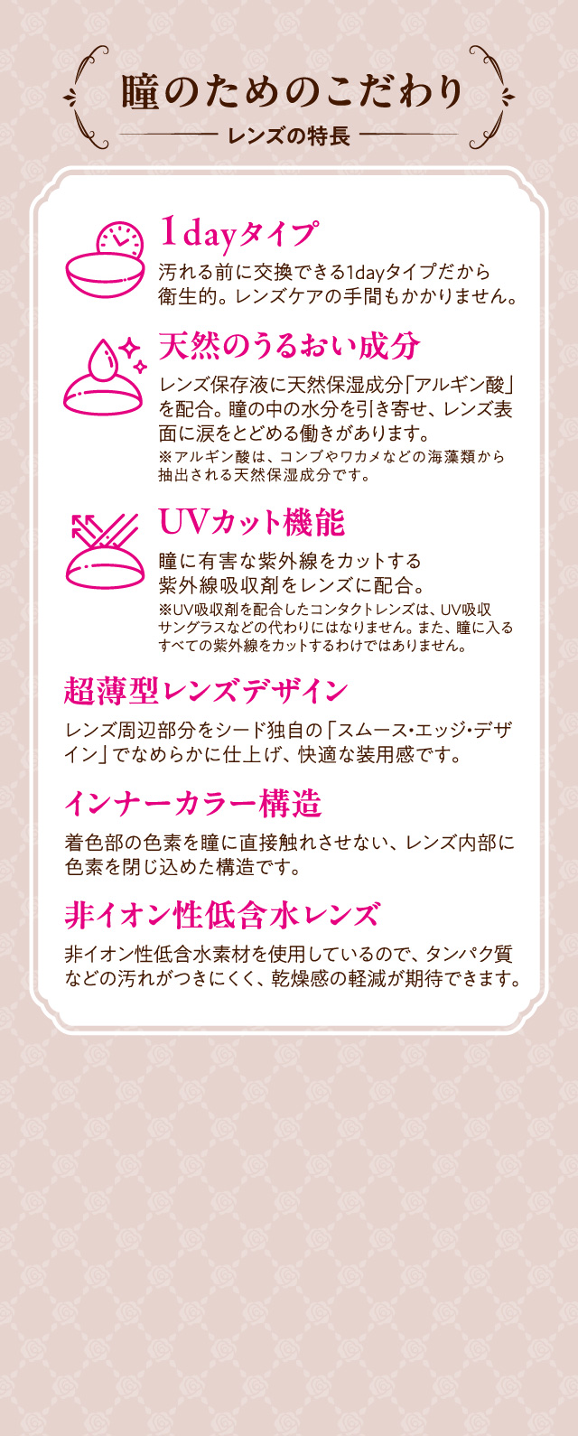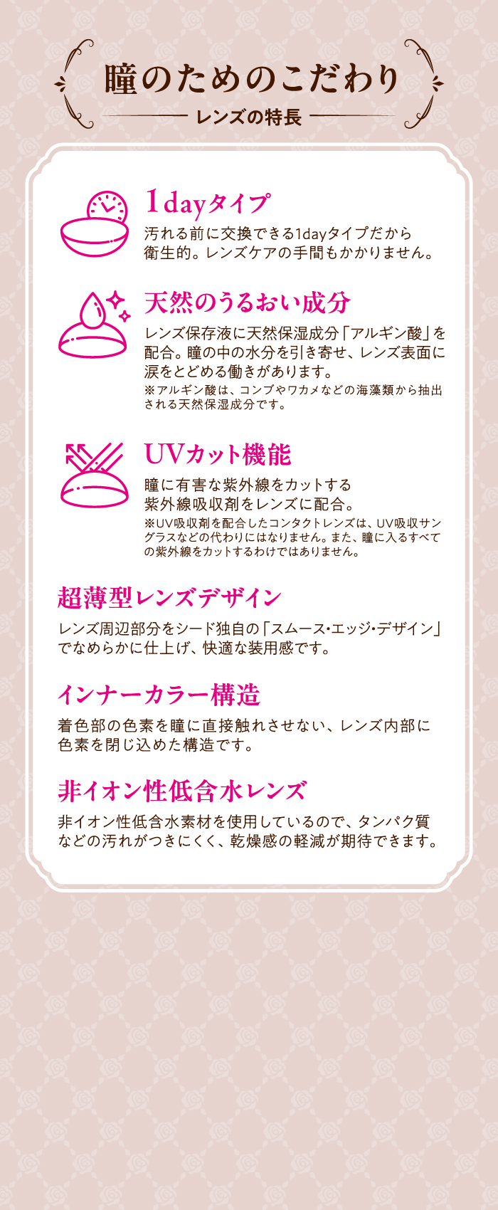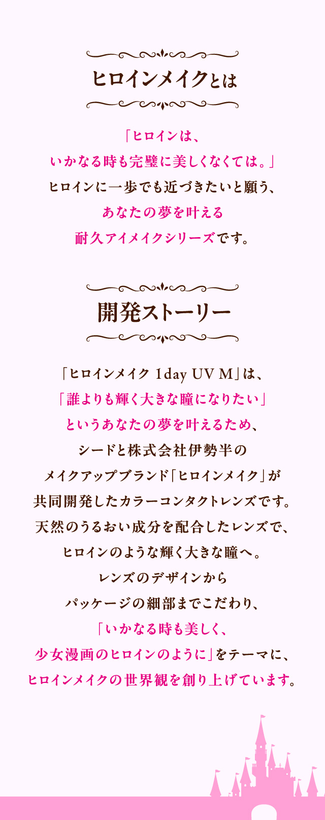 レンズ保存液には天然のうるおい成分を配合。レンズ表面に涙をとどめ、ヒロインのような大きな瞳へ。レンズデザインやパッケージにもこだわり、ヒロインメイクの世界観を元にかわいく上品に仕上げました。