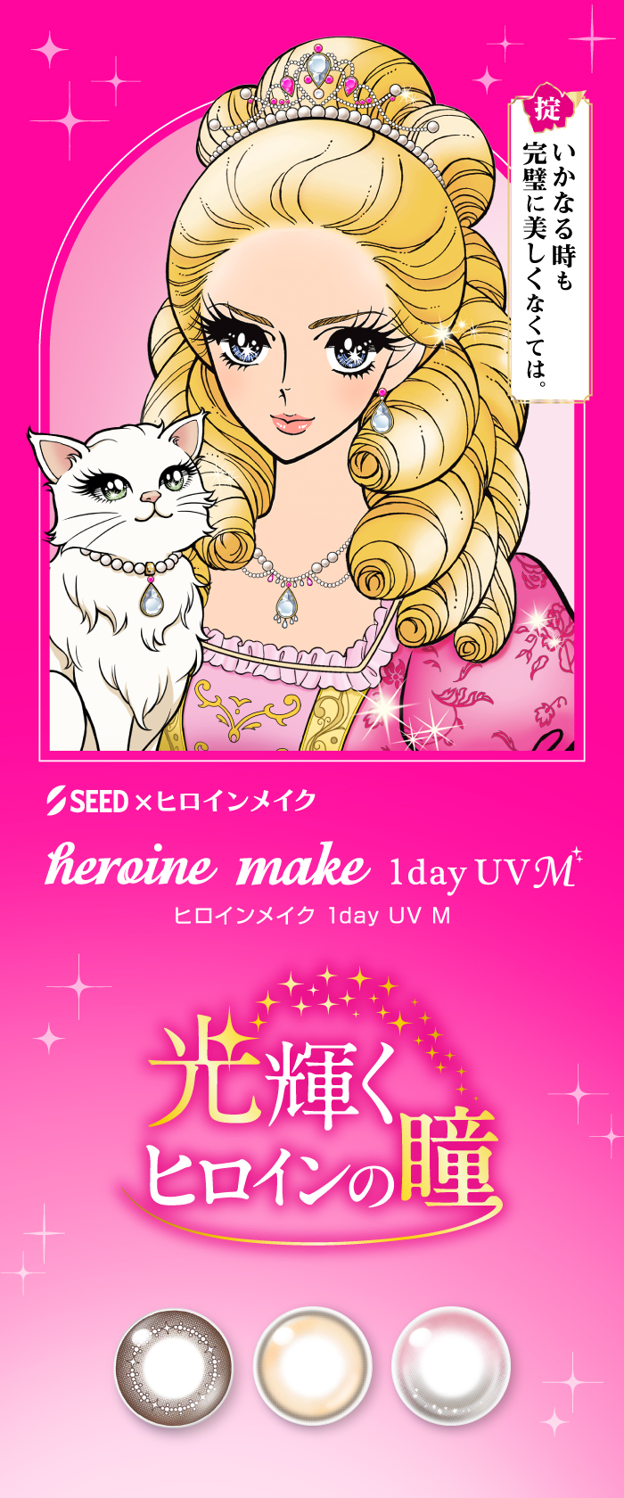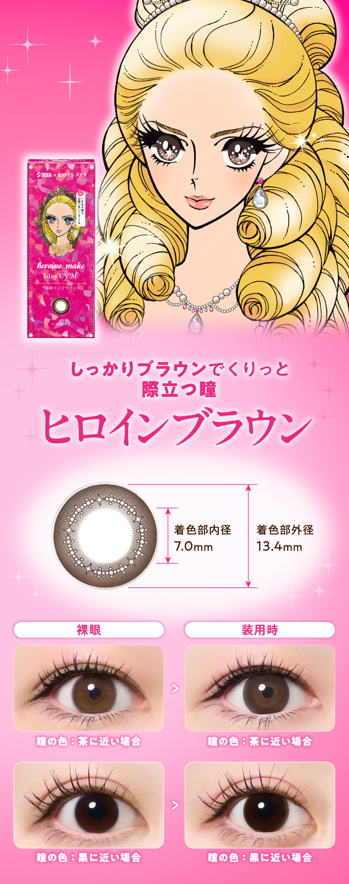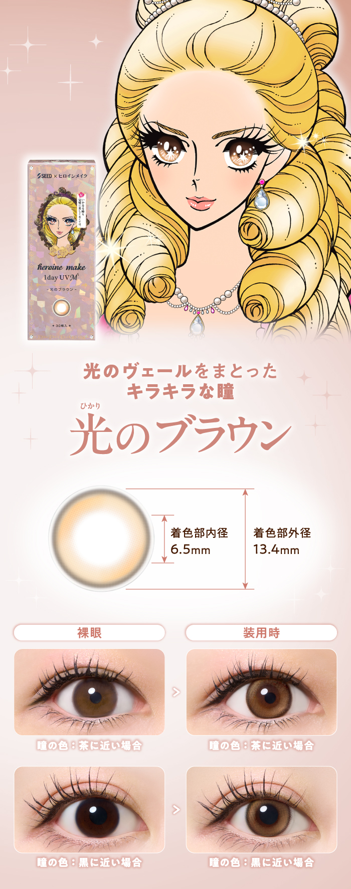 「誰よりも輝く大きな瞳になりたい」そんな女の子の夢を叶えるため、シードとメイクアップブランド「ヒロインメイク」が共同開発したカラーコンタクトレンズです。