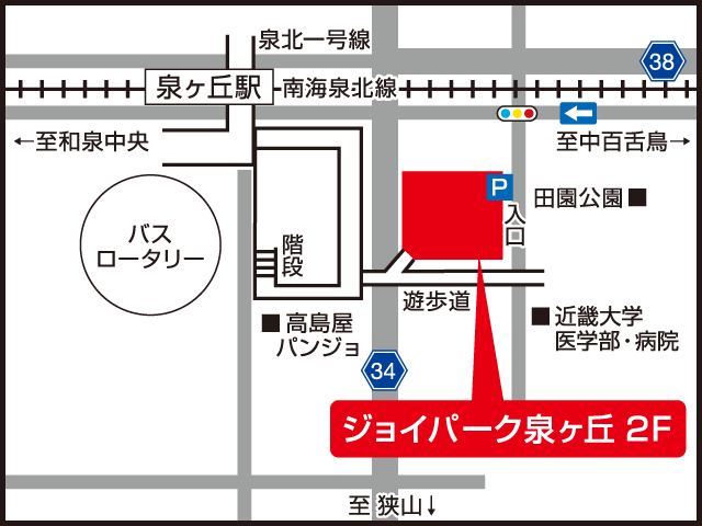 当店は、南海泉北線「泉ヶ丘」駅より徒歩約5分のジョイパーク泉ヶ丘2Fにございます。