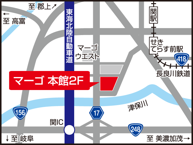 映画鑑賞が楽しめるシネックスマーゴ、癒しスポット倉知温泉マーゴの湯、ニトリマーゴ関店さん、MEGAドンキホーテ関マーゴ店さんなど人気店が多数お店を構えるマーゴウエストが隣接しており、ますます賑わいを見せるショッピングセンターマーゴ本館の2階にございます。