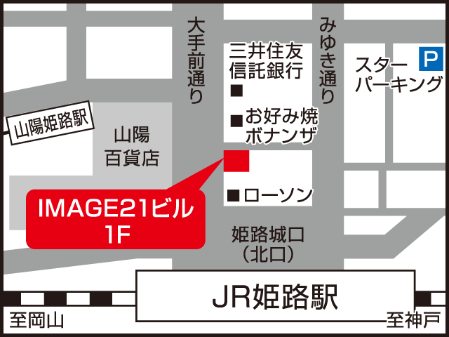 JR姫路駅北口をでて「大手前通り」の方向へおすすみください。歩道右側にIMAGE21ビルがありそちらの1階になります。 お車でお越しの際はスターパーキングをご利用ください。駐車券をお出しいたします(※最大2時間分まで)。