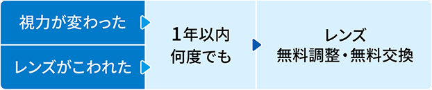 視力の変化などにより調整が必要な場合や破損した場合、ご購入日より1年以内なら何度でも調整や交換ができます。