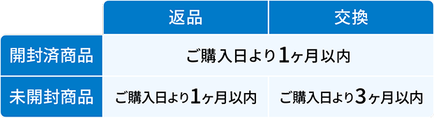 返品・交換を希望される商品のパッケージの状態で、返品・交換可能な期間が異なります。